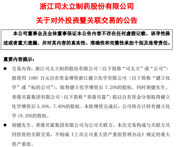 由于司太立控股股東、實際控制人之一胡健同時持有健立化學25%的股份并擔任健立化學執行董事,胡健的夫人盧唯唯實際控制并擔任香港貝霖集團有限公司執行董事,根據相關規定,胡健、香港貝霖為司太立關聯方,故此次交易構成與關聯方共同投資的關聯交易。