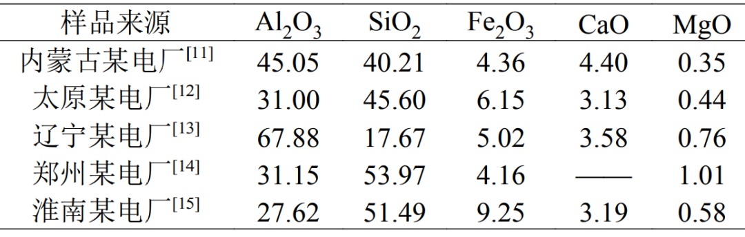 我國不同產地粉煤灰的化學成分如下表所示。可以看出,粉煤灰的主要化學成分是Al2O3和SiO2,質量分數約占75%以上,還含有其他少量的金屬氧化物。