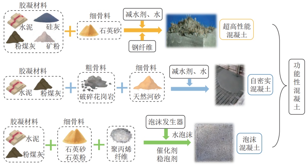 為滿足日益復雜的工程需求,需要通過調控添加劑種類和成分配比來實現混凝土的性能優化,實現混凝土的高強度、高性能和多功能化發展。摻入粉煤灰可以制備功能化混凝土,如超高性能混凝土、自密實混凝土、泡沫混凝土及加氣混凝土等。