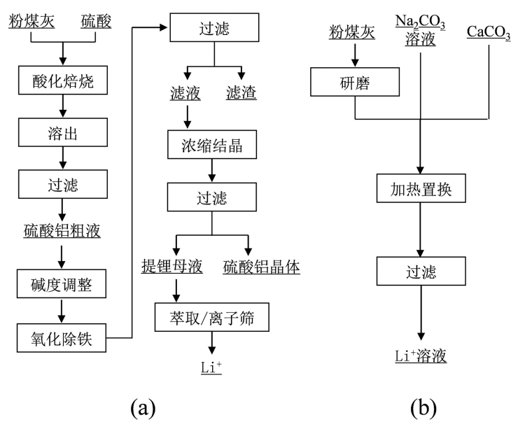 粉煤灰中提取Li工藝流程圖(a)硫酸焙燒法(b)碳酸鈉燒結法
