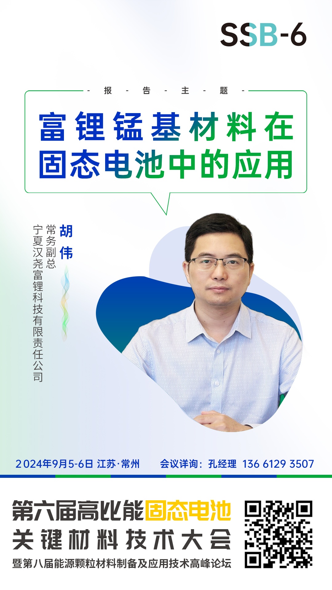 針對固態電池相關的技術、材料、市場及產業等方面的問題,中國粉體網將于2024年9月5-6日在常州舉辦第六屆高比能固態電池關鍵材料技術大會。為致力于固態電池技術開發的企業,科研院校,以及電動車、儲能、特種應用等終端企業提供信息交流的平臺,開展產、學、研合作,共同推動行業發展。屆時,來自寧夏漢堯富鋰科技有限責任公司的常務副總經理胡偉將作題為《富鋰錳基材料在固態電池中的應用》的報告。