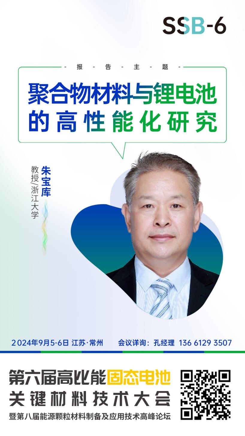 針對固態電池相關的技術、材料、市場及產業等方面的問題,中國粉體網將于2024年9月5-6日在常州舉辦第六屆高比能固態電池關鍵材料技術大會。為致力于固態電池技術開發的企業,科研院校,以及電動車、儲能、特種應用等終端企業提供信息交流的平臺,開展產、學、研合作,共同推動行業發展。屆時,來自浙江大學的朱寶庫教授將作題為《聚合物材料與鋰電池的高性能化研究》的報告。在報告中,朱教授將介紹電池隔膜高性能化的設計、以及聚烯烴等隔膜涂層、接枝、鋰化等高性能化的方法,以及提高隔膜電導率、降低界面電阻、抑制鋰枝晶形成、提高電池性能的機制;介紹新型正負極粘接劑體系的設計、制備及其對提高電池性能的效果與原理,從電池系統設計和制造出發,探討鋰電池用粘接、隔膜的選擇原則及電池的制作方法,支持液態、凝膠及固態金屬氧化物電池和鋰硫電池技術的發展。