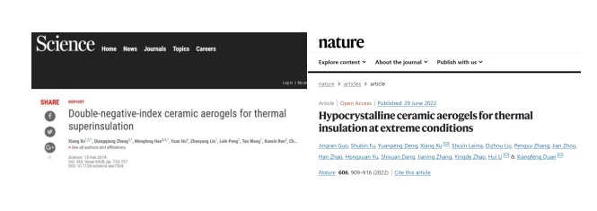 徐翔教授曾于2019年2月15日在Science上發(fā)表《雙負陶瓷氣凝膠超隔熱材》(Double-negative-indexceramic aerogels for thermal superinsulation),于2022年6月30日在Nature上發(fā)表《半晶質(zhì)陶瓷氣凝膠極端隔熱材料》(Hypocrystalline ceramic aerogels for thermal insulation at extreme conditions),該研究獲得了具備輕質(zhì)超柔韌、高熱穩(wěn)定性及高溫超隔熱等特性的陶瓷氣凝膠,該成果可廣泛應(yīng)用于航天等領(lǐng)域極端、復(fù)雜服役條件下隔熱保溫、減重增容、節(jié)能降耗、系統(tǒng)安全、性能穩(wěn)定,以及土木工程超大地震中結(jié)構(gòu)破壞大變形監(jiān)測中。