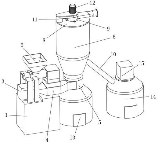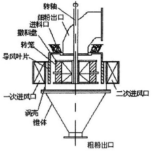 渦輪式氣流分級機一般包含蝸殼、轉籠、錐桶、導風葉片、撒料盤等主要結構。