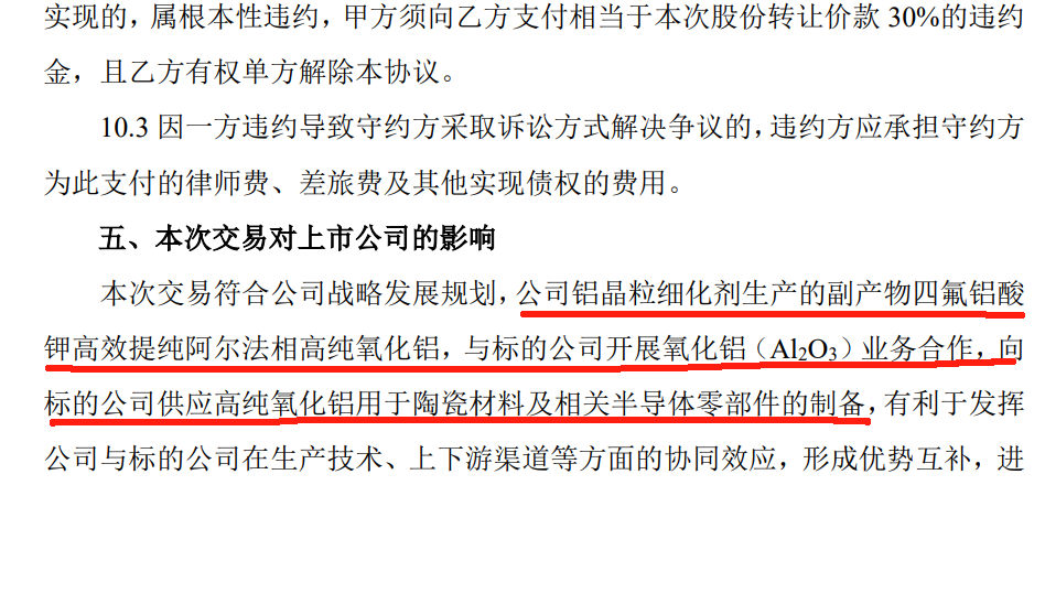 深圳新星在公告中表示,公司鋁晶粒細化劑生產的副產物四氟鋁酸鉀高效提純阿爾法相高純氧化鋁,與標的公司開展氧化鋁(Al2O3)業務合作,向標的公司供應高純氧化鋁用于陶瓷材料及相關半導體零部件的制備。