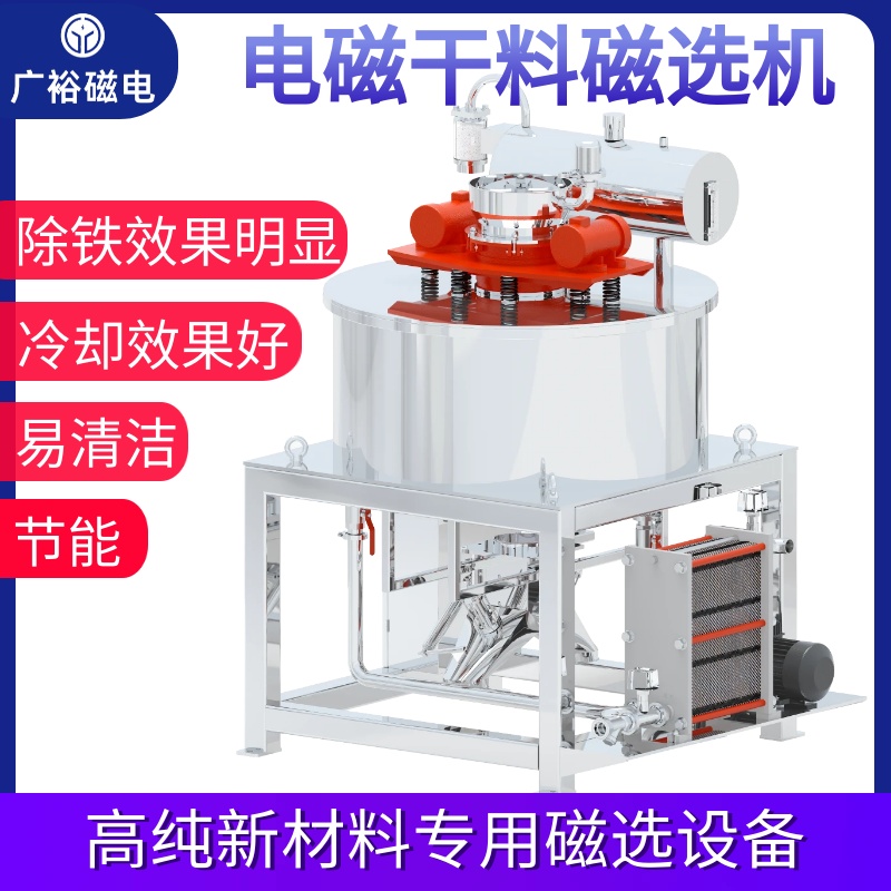 粉料高效磁選機系列是我公司根據石英砂、精細化工粉料的特性及自身技術優勢研發的一個系列設備,相比之前的電磁干粉設備,該設備具有:磁場梯度高,物料與磁介質接觸面積更大、磁場分布均勻,磁介質采用全新材料,導磁性能更好、自帶下料分散系統、磁場強度根據物料可調等優點;能有效地分離去除加工過程中粉體中的鐵、鈦等磁性物質。