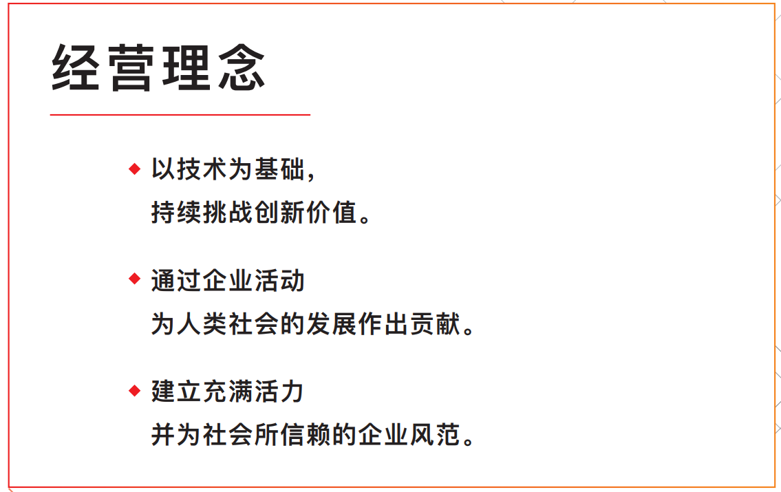 住友化學自成立以來,始終貫徹“以技術為基礎,持續挑戰創新價值;通過企業活動為人類社會的發展做出貢獻;建立充滿活力并為社會所信賴的企業風范”的三大經營理念于其管理實踐中。