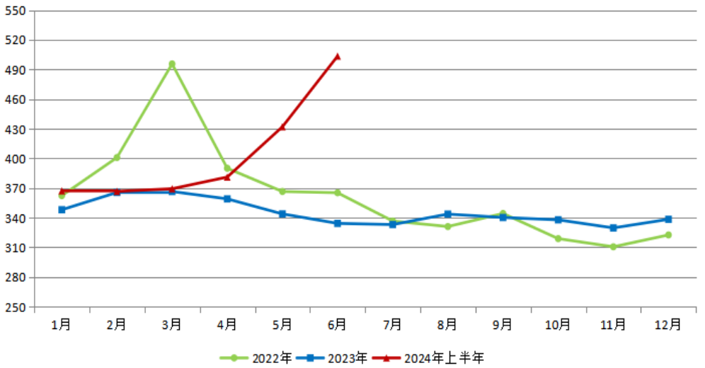 2024年上半年,國(guó)內(nèi)外氧化鋁現(xiàn)貨價(jià)格均呈現(xiàn)階梯上行走勢(shì)。
