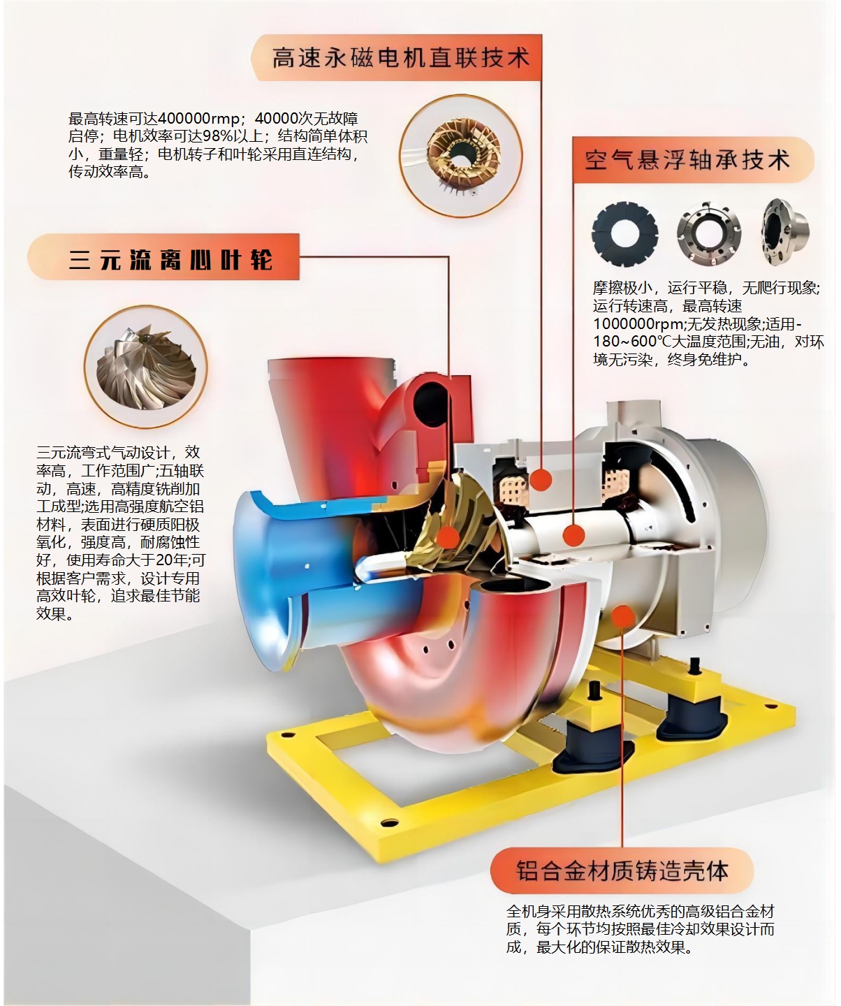 空氣懸浮離心鼓風機的核心部件主要由三元流離心葉輪、空氣懸浮軸承、高速矢量控制變頻器、高速永磁同步電機 及其云端智能控制系統。葉輪在高速旋轉時產生空氣流動,從而實現鼓風。空氣軸承是空氣懸浮鼓風機的關鍵技術之一,主要通過利用空氣作為潤滑劑,通過利用氣膜效應,在軸承內形成一層氣膜,使軸承與軸承座之間產生懸浮,實現非接觸性支撐,有效減少機械摩擦和能量損耗。變頻器主要用于調節高速永磁電機的轉速, 使鼓風機可以根據實際需要進行調速。高速永磁同步電機是驅動葉輪旋轉的動力源,具有高效率、高功率密度、高轉速等特點。擁有核心自主知識產權,憑借節能、 低噪音、無油、運行可靠、操作維護簡便和半永久壽命等優勢,將成為未來百年內最節能的流體設備之一。