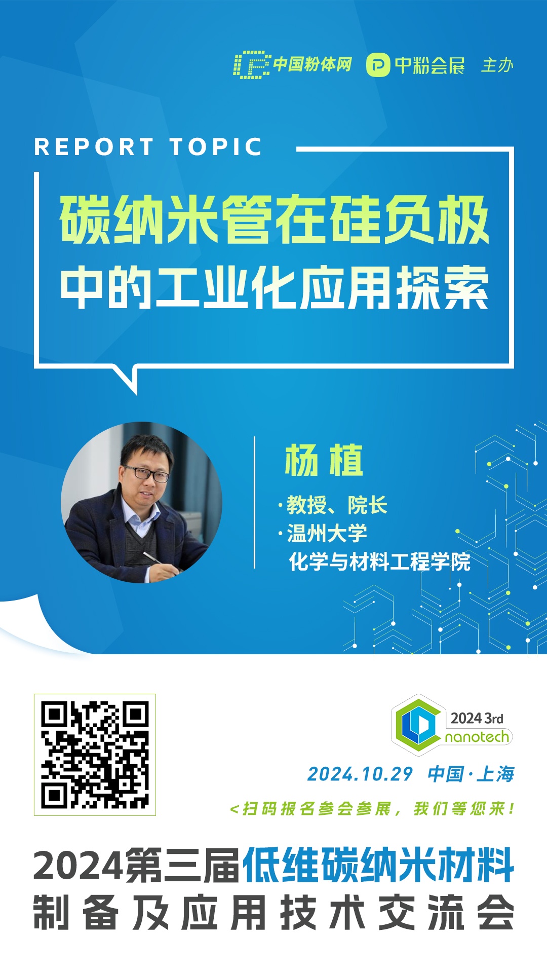 2024年10月29-31日在上海跨國采購會展中心,由北京粉體技術協會與柏德英思展覽(上海)有限公司聯合主辦2024第三屆低維碳納米材料制備及應用技術交流會。屆時來自溫州大學的楊植教授將作題為《碳納米管在硅負極中的工業化應用探索》的報告。報告主講人將介紹碳納米管如何在工業領域大規模應用的探索以及碳納米管在硅碳負極領域面臨的挑戰。