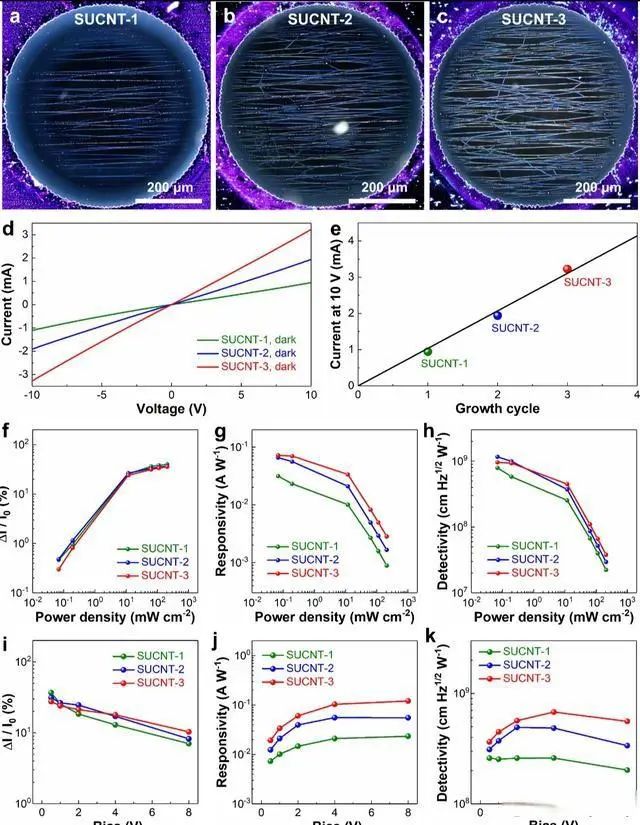 圖2.不同密度的超長碳納米管懸空網絡光電探測器的性能評價