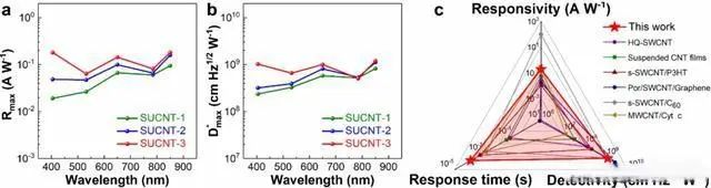 圖3.超長碳納米管懸空網絡光電探測器的寬譜響應行為和綜合性能對比
