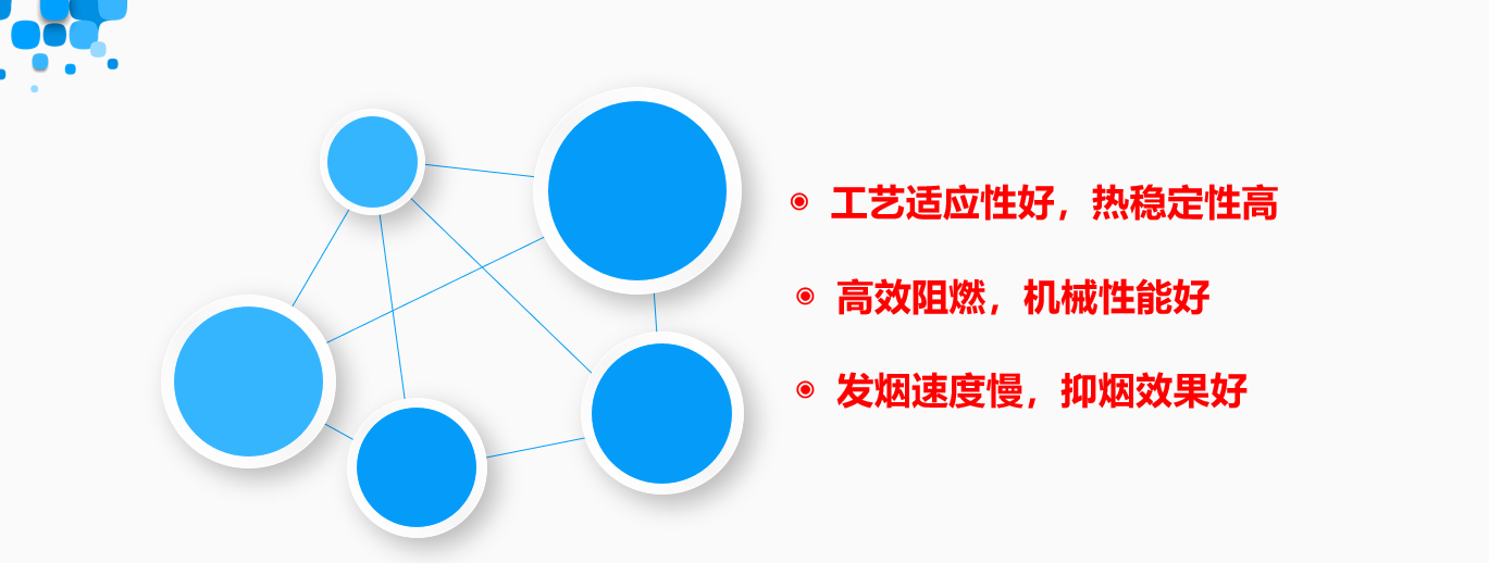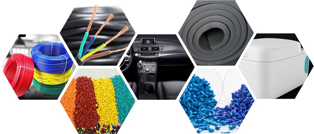低煙無鹵電線電纜阻燃料、聚氨酯發(fā)泡材料、熱塑性塑料、阻燃建筑材料、橡膠材料、絕緣層、高檔銅板紙?zhí)钔苛、乳膠制品、阻燃地毯、保護層……