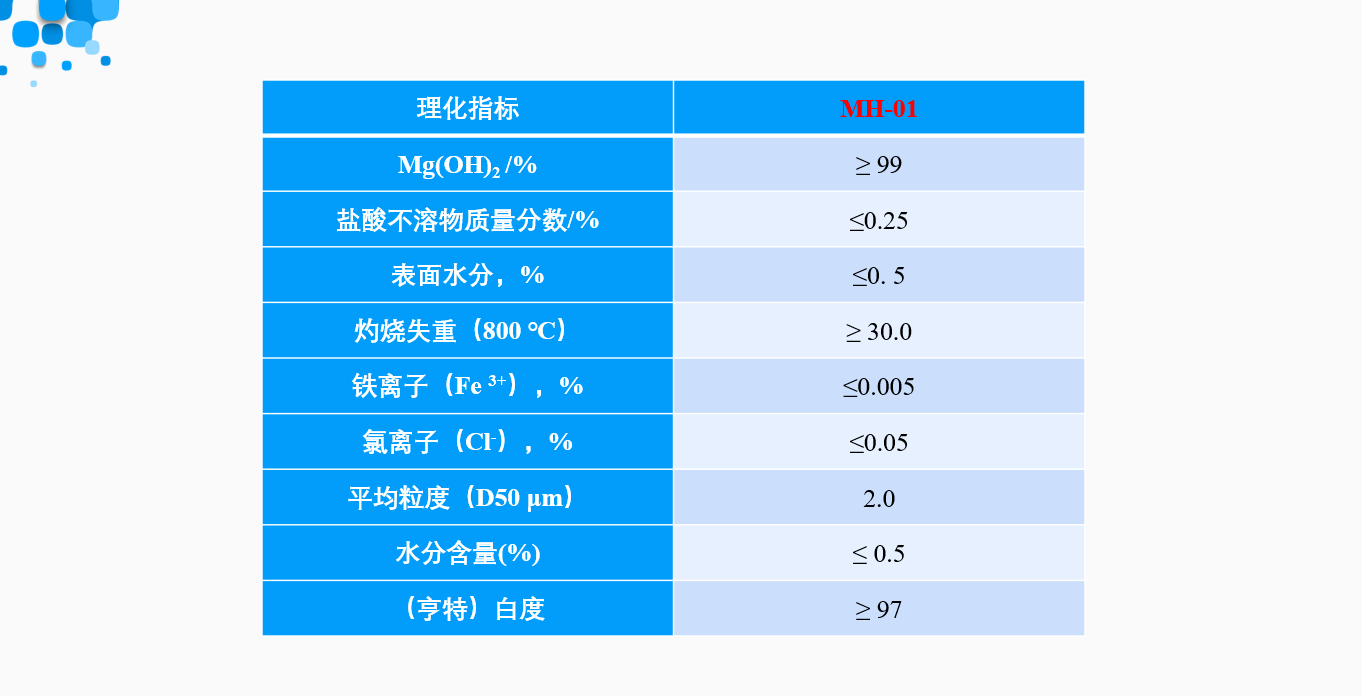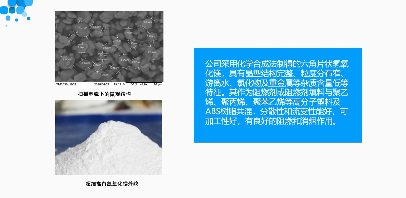 中超股份采用化學合成法制得的六角片狀氫氧化鎂,具有晶型結(jié)構(gòu)完整、粒度分布窄、游離水、氯化物及重金屬等雜質(zhì)含量低等特征。其作為阻燃劑或阻燃劑填料與聚乙烯、聚丙烯、聚苯乙烯等高分子塑料及ABS樹脂共混,分散性和流變性能好,可加工性好,有良好的阻燃和消煙作用。