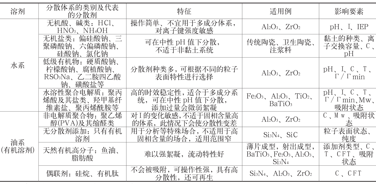 分散劑作為一種在分子結構上同時具有親水性和親油性兩種相反性質的界面活性劑,在懸浮液中能夠與陶瓷顆粒表面發生作用,從而降低分散體系中固體或液體粒子的聚集,均一分散那些難于溶解于液體的固體顆粒,同時也能防止固體顆粒的沉降和凝聚,形成穩定懸浮液膠體。