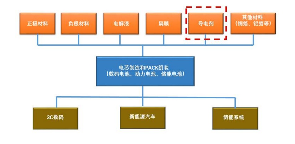 鋰電池的主要材料包括正極材料、負極材料、電解液和隔膜。導電劑作為一種關鍵輔材,可以增加活性物質之間的導電接觸,提升鋰電池中電子在電極中的傳輸速率,從而提升鋰電池的倍率性能和改善循環壽命。