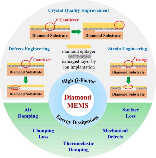 中國粉體網(wǎng)訊 近日,日本國立物質(zhì)材料研究所廖梅勇主席研究員團(tuán)隊的AMR述評文章“Low-Energy Dissipation Diamond MEMS”在線發(fā)表。文章基于其實驗室開發(fā)的“智能剪切”法所制備的器件,概述了實現(xiàn)超高品質(zhì)因子單晶金剛石微機電系統(tǒng)的最新研究進(jìn)展與策略。這些策略代表著推動金剛石MEMS諧振子性能提升與應(yīng)用擴展的關(guān)鍵技術(shù)。