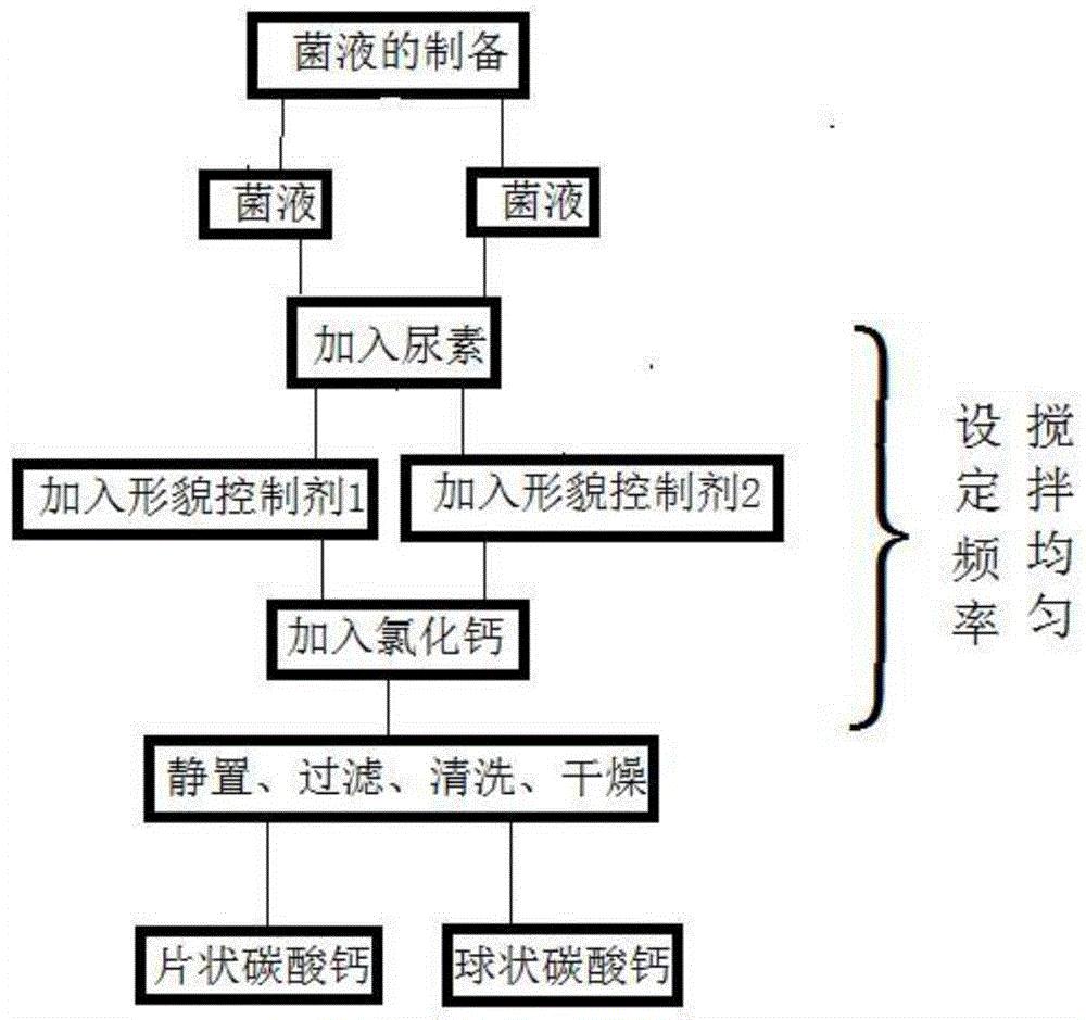 本發明利用微生物制備片狀碳酸鈣和球狀碳酸鈣,其中所利用的微生物資源豐富,反應高效,環境友好無污染,通過添加形貌控制劑來制備片狀和球狀碳酸鈣,提高了碳酸鈣應用的專一性,使碳酸鈣在多領域的應用更加高效。
