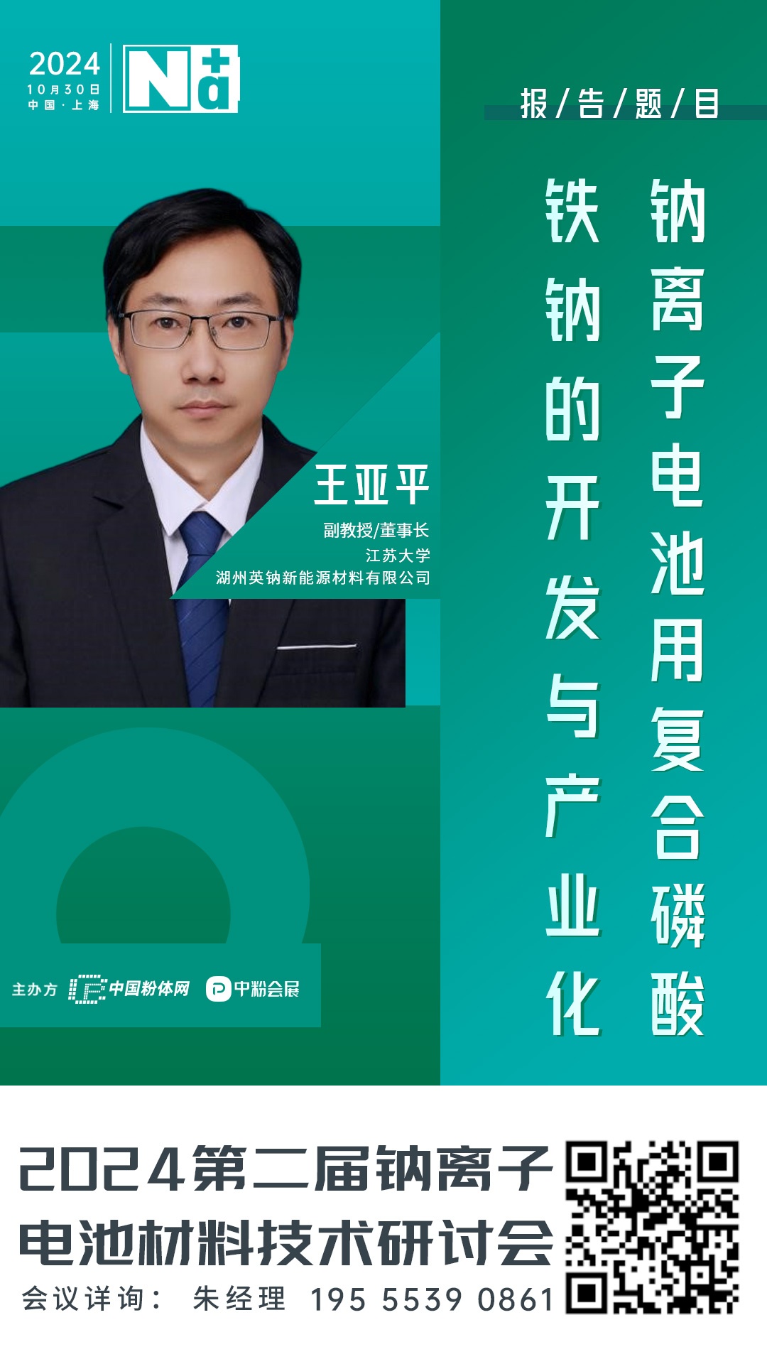 2024年10月29-31日在上海跨國采購會展中心,由北京粉體技術協會與柏德英思展覽(上海)有限公司聯合主辦2024第二屆鈉離子電池材料技術研討會。屆時,來自江蘇大學/湖州英鈉新能源材料有限公司的王亞平副教授/董事長將作題為《鈉離子電池用復合磷酸鐵鈉的開發與產業化》的報告。本次報告將就復合磷酸鐵鈉正極材料開發的進展進行匯報和探討,重點介紹當前復合磷酸鐵鈉正極材料實用化的主要痛點及潛在的解決方案。