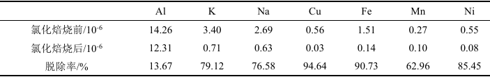 潘俊良等采用Cl2為氯化劑對石英砂樣品進行氯化焙燒,在氣體流速600ml/min、焙燒溫度900℃、焙燒時間60min條件下,樣品雜質含量由29.4X10-6降至23.3X10-6,且焙燒過程對Al、堿土金屬和過渡金屬元素的去除效果較好,但是對堿金屬元素去除效果不明顯,所得石英砂含量達到4N8高純石英的標準。