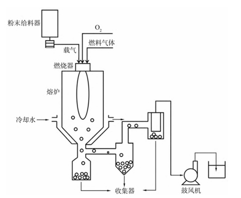 氣體燃燒火焰成球法是以乙炔氣、氫氣、天然氣等工業(yè)燃料氣體作為產(chǎn)生潔凈無污染火焰的熱源,通過高溫火焰噴槍噴出1600~2000℃的高溫火焰,將預(yù)處理后合格的粉體通過送粉器送入球化爐中。采用氧氣-燃料氣體射流對粉體進(jìn)行加熱驅(qū)動和高溫熔融、而后冷卻成球,最終形成高純度球形粉體,此方法多用于球形硅微粉體以及球形氧化鋁粉體的制備。