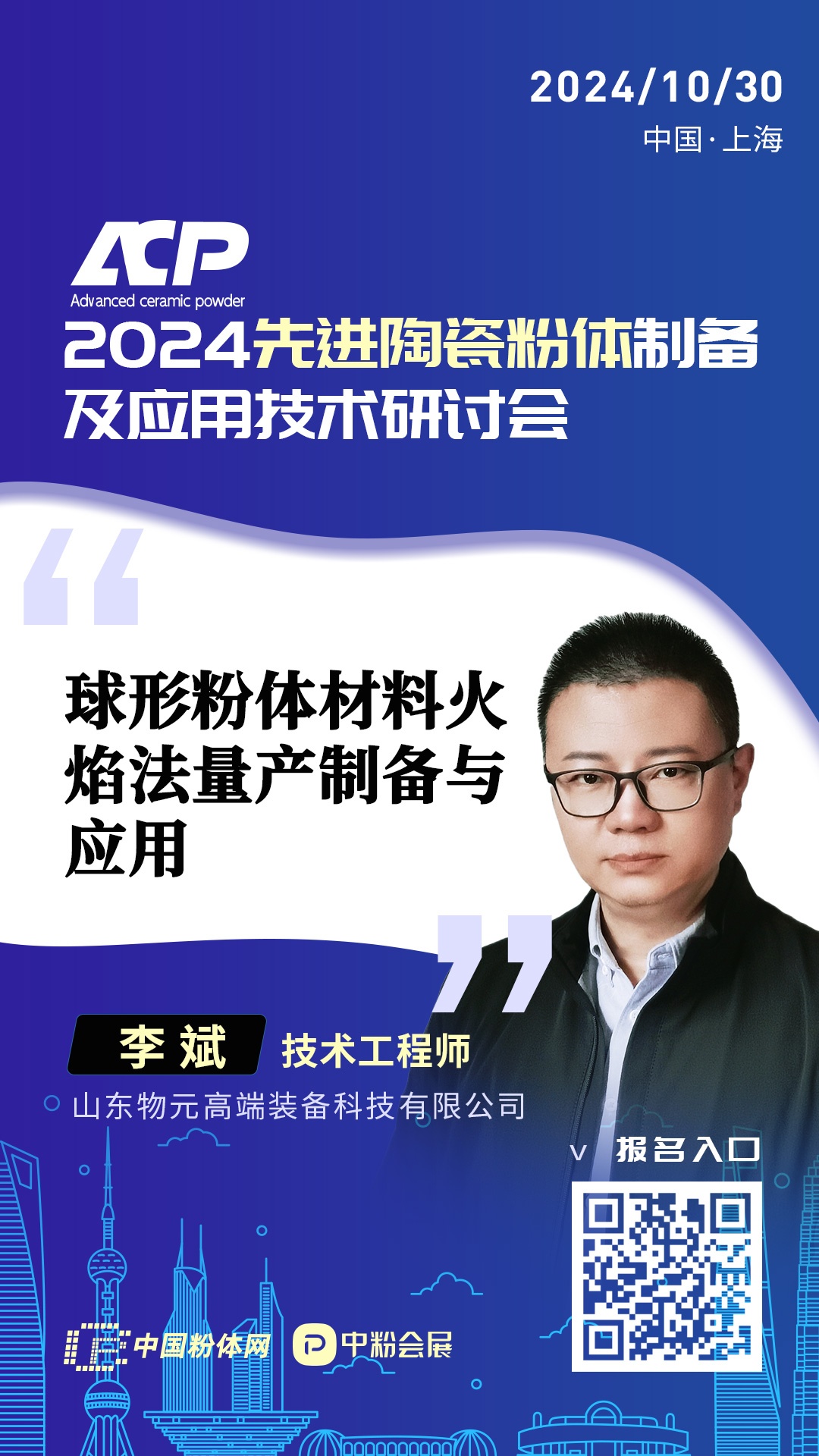 2024年10月29-31日在上海跨國采購會展中心,由北京粉體技術(shù)協(xié)會與柏德英思展覽(上海)有限公司聯(lián)合主辦“2024先進(jìn)陶瓷粉體制備及應(yīng)用技術(shù)研討會”,屆時,來自山東物元高端裝備科技有限公司技術(shù)工程師李斌將帶來《球形粉體材料火焰法量產(chǎn)制備與應(yīng)用》的報告。