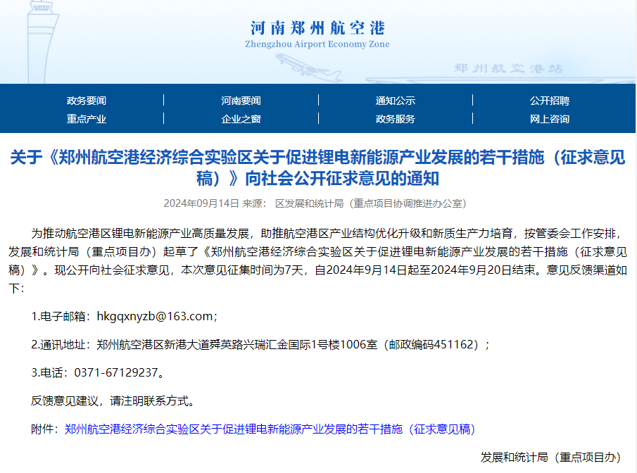 鄭州市:《鄭州航空港經濟綜合實驗區關于促進鋰電新能源產業發展的若干措施(征求意見稿)》