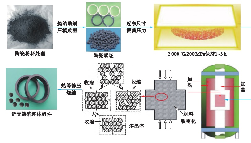熱等靜壓燒結(jié)是一種燒結(jié)工程陶瓷快速致密化的最有效方法。該方法以氣體作為壓力介質(zhì),燒結(jié)過(guò)程中在產(chǎn)品的各個(gè)方向上施加同等壓力,在高溫、高壓作用下實(shí)現(xiàn)產(chǎn)品致密化。相比于其他燒結(jié)方式,熱等靜壓燒結(jié)制品具有更理想的壓碎載荷比、離散度和截面孔隙度,進(jìn)而獲得更好的軸承組件硬度和斷裂韌性。目前,美國(guó)ORTECH、加拿大CYCLONE、日本UBE等公司生產(chǎn)的氮化硅陶瓷球均采用熱等靜壓燒結(jié)方式。而國(guó)內(nèi)廠商受限于燒結(jié)過(guò)程中用于隔絕高溫/高壓氣體的包套的相關(guān)制備技術(shù)不成熟,無(wú)法實(shí)現(xiàn)粉體在惡劣環(huán)境中的直接熱等靜壓燒結(jié)成型,因而多采用氣壓燒結(jié)預(yù)成型后,再經(jīng)熱等靜壓二次燒結(jié)處理,該種燒結(jié)方式制得的陶瓷軸承組件與直接熱等靜壓成型相比,其硬度和斷裂韌性等屬性均有所下降。