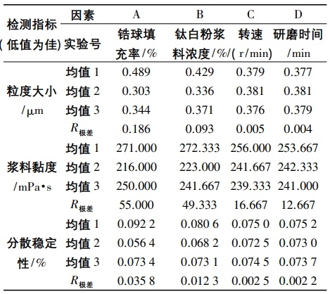穆宇同等在不同的砂磨工藝條件即研磨介質填充率、鈦白粉進料量、不同轉速、不同研磨時間對鈦白粉漿料粒徑、漿料黏度與分散穩定性能的影響,最終確定了較優的工藝方案。