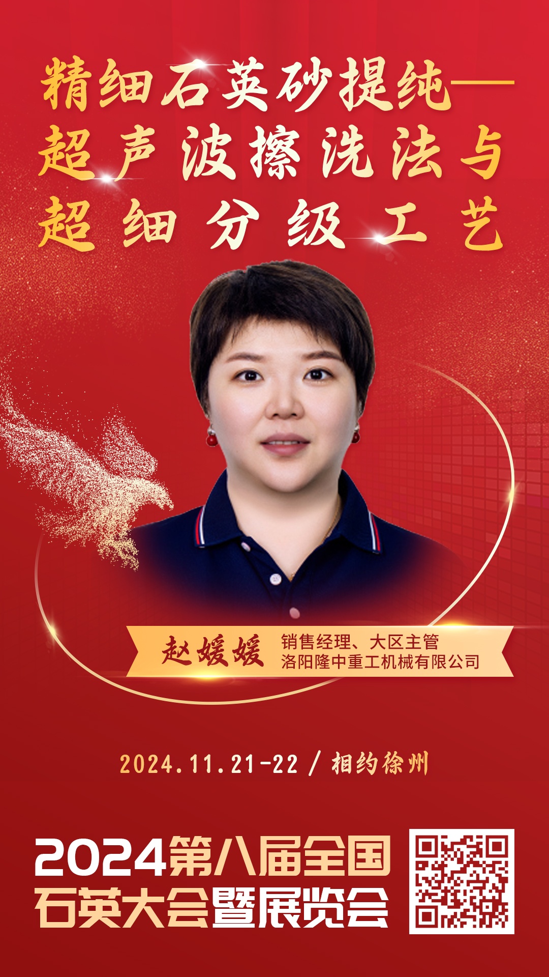 2024年11月21-22日,由中國(guó)粉體網(wǎng)主辦的“2024(第八屆)全國(guó)石英大會(huì)暨展覽會(huì)”將在江蘇徐州召開(kāi),洛陽(yáng)隆中重工機(jī)械有限公司的銷售經(jīng)理、大區(qū)主管趙媛媛將做《精細(xì)石英砂提純一超聲波擦洗法與超細(xì)分級(jí)工藝》的報(bào)告,屆時(shí),她將結(jié)合公司產(chǎn)品應(yīng)用案例,詳細(xì)解讀精細(xì)石英砂提純一超聲波擦洗法與超細(xì)分級(jí)工藝。