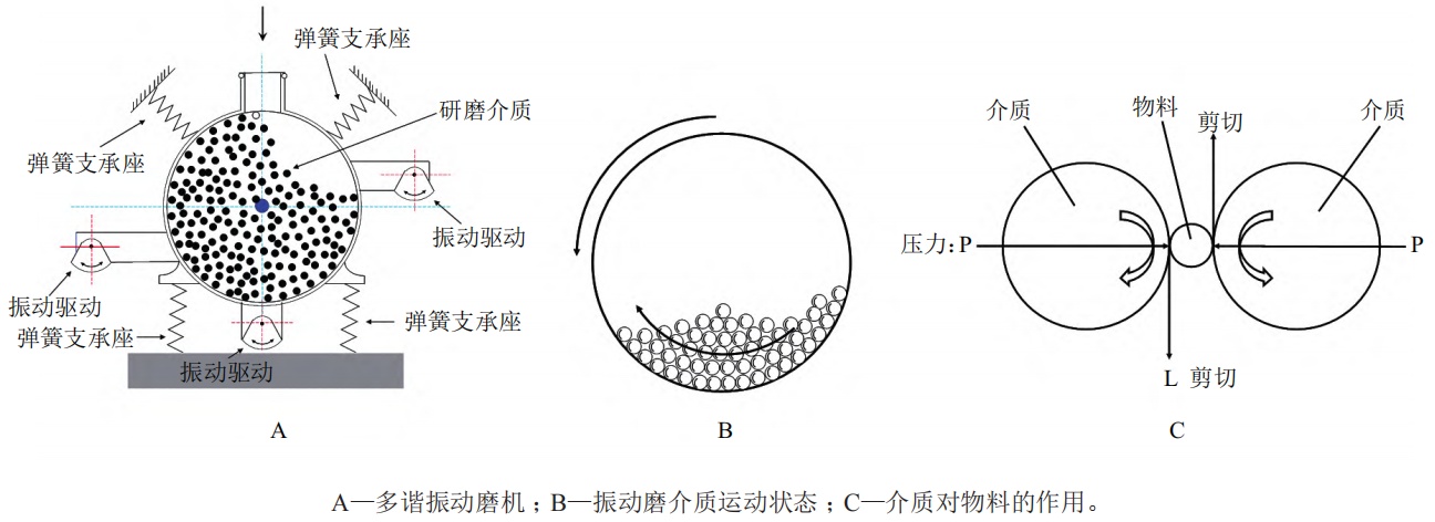振動磨包括研磨介質、研磨缽體及偏心激振裝置。其工作原理復雜且多尺度,偏心機構驅動缽體作周期性高頻振動,研磨介質隨之運動并對物料產生多種作用力,加劇物料中裂紋的延伸,從而使外部結構破碎。