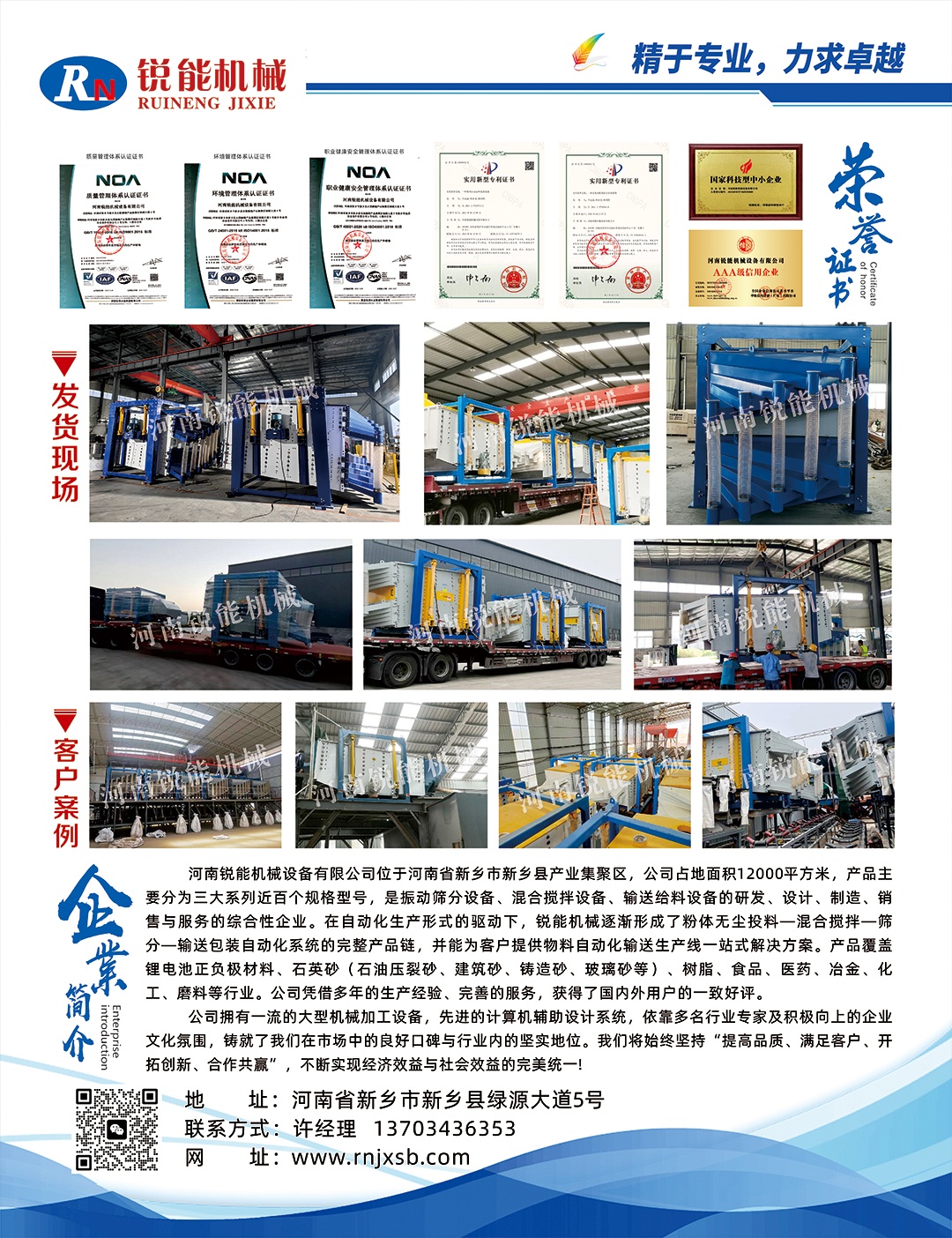 河南銳能機(jī)械設(shè)備有限公司位于河南省新鄉(xiāng)市新鄉(xiāng)縣產(chǎn)業(yè)集聚區(qū),以西南科技大學(xué)、中國(guó)物理研究院為強(qiáng)大技術(shù)支撐,公司產(chǎn)品主要分為三大系列近百個(gè)規(guī)格型號(hào),是振動(dòng)篩分設(shè)備、混合攪拌設(shè)備、輸送給料設(shè)備的研發(fā)、設(shè)計(jì)、制造、銷(xiāo)售與服務(wù)的綜合性企業(yè)。在自動(dòng)化生產(chǎn)形式的驅(qū)動(dòng)下,銳能機(jī)械逐漸形成了粉體無(wú)塵投料一混合攪拌-篩分一輸送包裝自動(dòng)化系統(tǒng)的完整產(chǎn)品鏈,并能為客戶(hù)提供物料自動(dòng)化輸送生產(chǎn)線一站式解決方案。生產(chǎn)基地設(shè)立在河南省新鄉(xiāng)市新鄉(xiāng)縣產(chǎn)業(yè)集聚區(qū),占地12000平方米。產(chǎn)品覆蓋鋰電池正負(fù)極材料、石英砂(石油壓裂砂、建筑砂、鑄造砂、玻璃砂等)、樹(shù)脂、食品、醫(yī)藥、冶金、化工、磨料等行業(yè)。公司憑借多年的生產(chǎn)經(jīng)驗(yàn)、完善的售后服務(wù),獲得了國(guó)內(nèi)外用戶(hù)的一致好評(píng)。