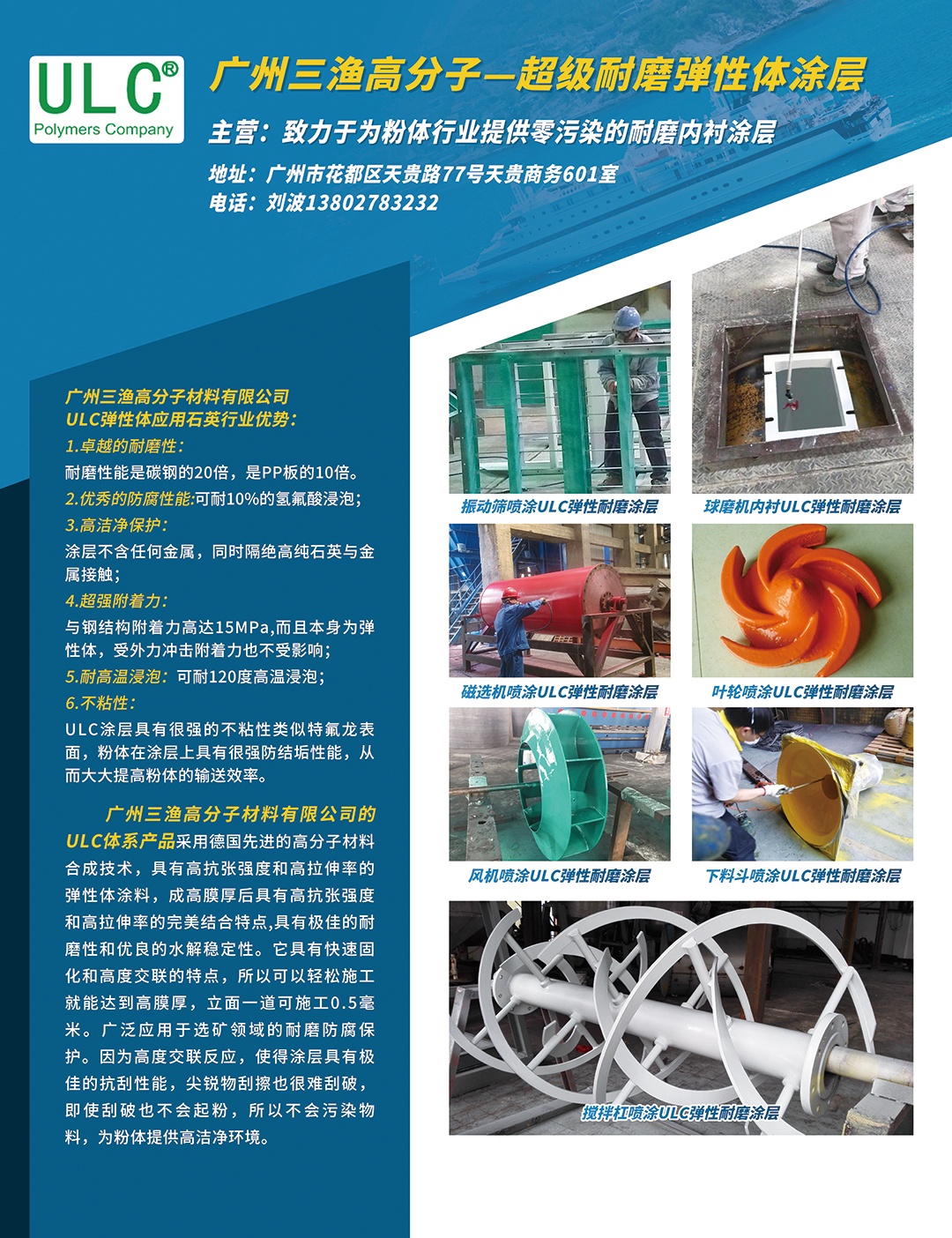 廣州三漁高分子材料有限公司專注可噴涂高分子彈性體材料的研究及開發,引入德國可噴涂高分子彈性體材料生產技術,經過多年國內實踐應用,公司產品已經在多個嚴重磨損領域和重防腐領域得到廣泛的應用,特別是在強酸性或強堿性同時又是磨損嚴重的工況環境下,高性能的高分子彈性體涂層能夠提供卓越的保護。例如重度磨損領域選礦設備:磁選機滾筒耐磨保護、渣漿泵葉輪及泵體耐磨保護、重型選礦振動篩耐磨保護、浮選槽及浮選轉子浮選軸耐磨保護、螺旋分級機葉片耐磨保護、三通及彎頭耐磨保護、玻璃鋼螺旋溜檣耐磨保護、玻璃鋼圓錐耐磨保護等。在自動化領域也有廣泛的應用,例如振動盤耐磨降噪音,耐油重工件振動盤,電子元件防靜電振動盤等。重防腐領域例如硫酸池重防腐、化工廠廢水池重防腐、酸性平臺重防腐、重防腐地坪、化工攪拌槽及攪拌杠重防腐等。大大減少用戶因磨損和腐蝕帶來的損失。