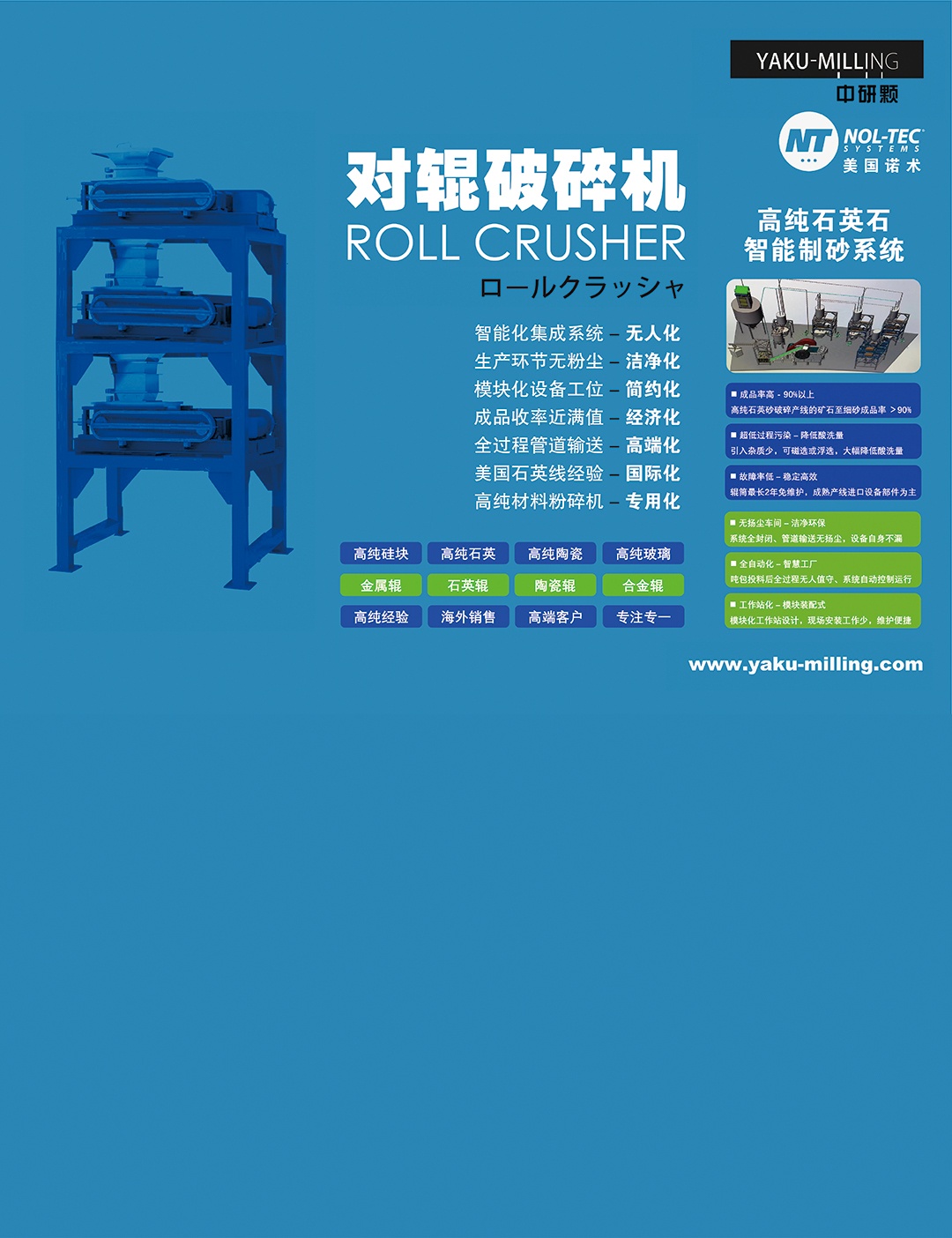 公司生產(chǎn)制造日本對(duì)輥機(jī)設(shè)備,原料粉碎粒徑可達(dá)0.5mm,出料雙重粒徑控制系統(tǒng)確保粒徑均勻,不漏粉不卡料不污染原料。