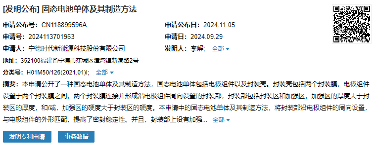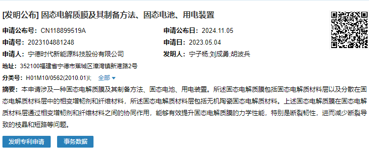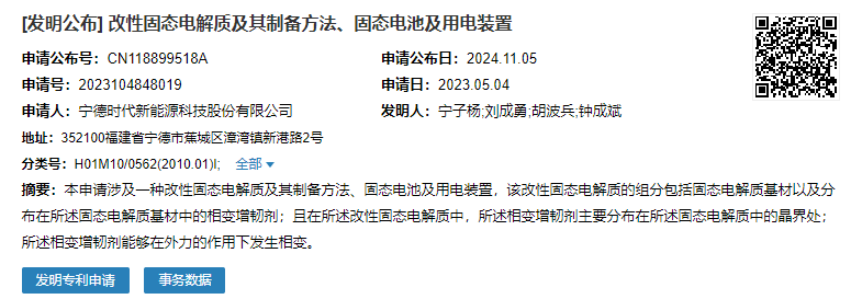 中國粉體網訊 11月5日,國家知識產權局公布了寧德時代三項固態電池專利,分別為“改性固態電解質及其制備方法、固態電池及用電裝置”、“固態電解質膜及其制備方法、固態電池、用電裝置”和“固態電池單體及其制造方法”。
