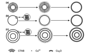 Wang等報(bào)道了通過(guò)使用十六烷基三甲基溴化銨(CTAB)作為囊泡模板來(lái)合成具有單晶殼結(jié)構(gòu)的多殼空心Cu2O球,控制CTAB的濃度,形成的不同層數(shù)的囊泡模板最終形成了單殼、雙殼、三殼、四殼結(jié)構(gòu)的 Cu2O 空心球。