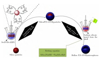 硬模板法是制備中空微球及多殼層微球等常用和成熟的方法之一。硬模板是納/微米級(jí)的剛性材料,包括金屬、二氧化硅(SiO2)、聚苯乙烯(PS)和碳球等。其中SiO2微球常作為模板,是由于SiO2表面帶有大量羥基,可修飾帶雙鍵或氨基的硅烷偶聯(lián)劑,增加聚合物反應(yīng)位點(diǎn),最后通過(guò)酸或堿蝕刻去除。