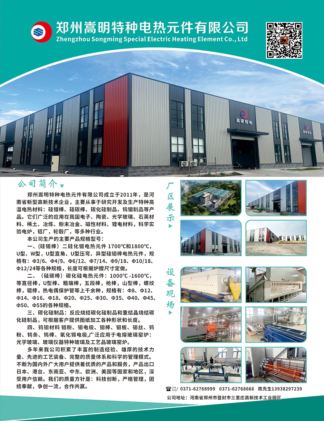 鄭州嵩明特種電熱材料有限公司,位于天下聞名的古剎少林寺之東南十公里處,是專(zhuān)業(yè)生產(chǎn)高溫電熱材料的高新技術(shù)企業(yè)。這里環(huán)境優(yōu)美,景色秀麗,交*利。公司生產(chǎn)設(shè)備精良,工藝技術(shù),檢驗(yàn)設(shè)備齊全,并且擁有一批高水準(zhǔn)的專(zhuān)業(yè)工程技術(shù)人員。主要開(kāi)發(fā)研制電熱材料產(chǎn)品有:硅碳棒硅鉬棒 鎢鉬材料及制品等系列產(chǎn)品。