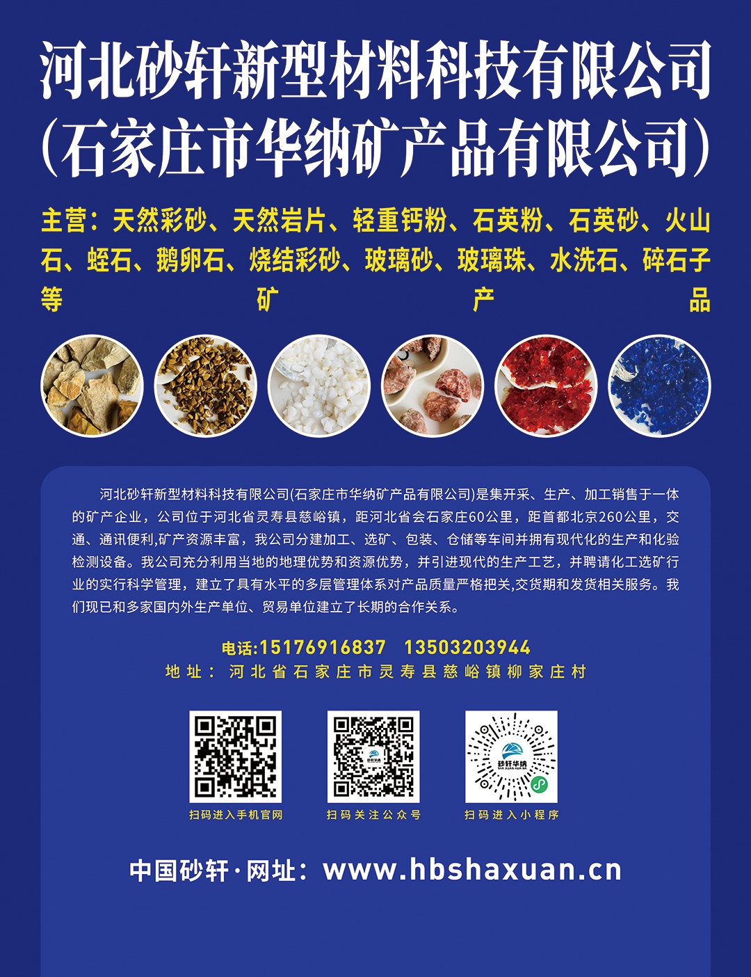 河北砂軒新型材料科技有限公司建于2017年,主要生產(chǎn)加工銷售天然彩砂、天然巖片、石英砂、蛭石、鵝卵石、金剛砂、碎石子、水洗石、火山石、重質(zhì)碳酸鈣、輕質(zhì)碳酸鈣、玻璃砂、玻璃珠、大塊碎玻璃、滑石粉、沸石粉、長(zhǎng)石、重晶石、漂珠、珍珠巖、螢石粉、電氣石、海泡石、高嶺土、膨潤(rùn)土、麥飯石、鋁礬土、硅藻土、石墨石等礦產(chǎn)品的加工銷售于一體礦產(chǎn)公司。