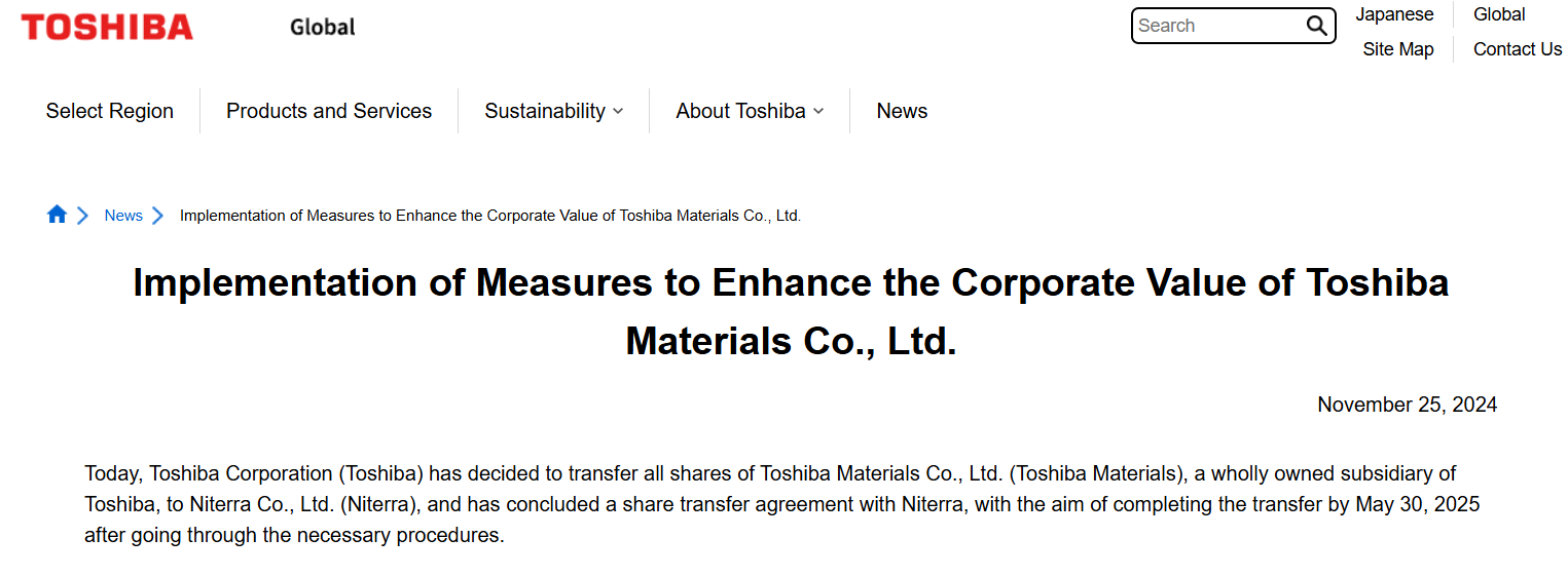 中國粉體網訊 11月25日,東芝(Toshiba)官網宣布將其全資子公司東芝材料株式會社(Toshiba Materials)所有股份轉讓給日本特殊陶業株式會社(Niterra),并與Niterra簽訂了股份轉讓協議,計劃在完成必要程序后于2025年5月30日前完成轉讓。