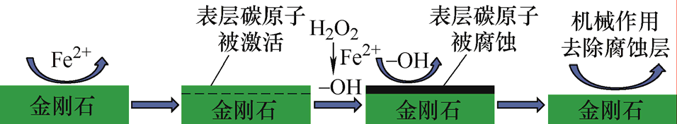 該過程基于芬頓(Fenton)反應拋光金剛石,將鐵浸入H2O2溶液中,生成亞鐵離子(Fe2+),Fe2+與 H2O2反應生成具有強氧化性的•OH,反應過程如下: