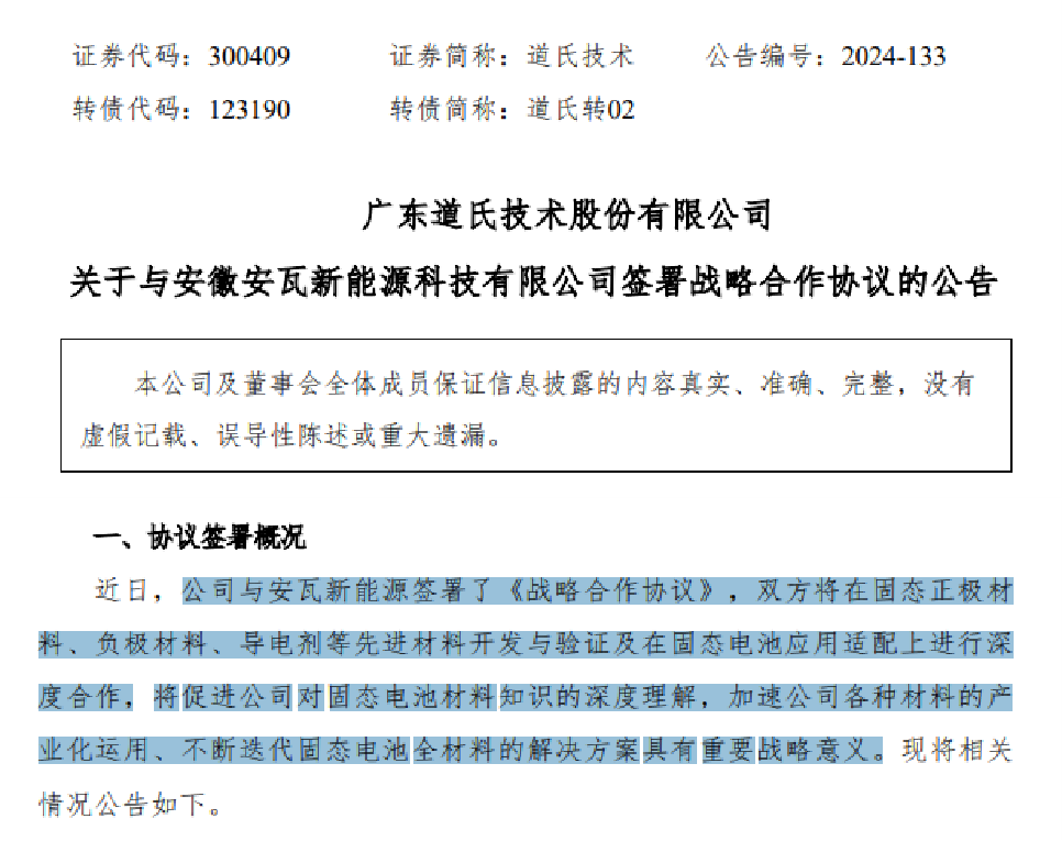 中國粉體網訊  12月4日,廣東道氏技術股份有限公司(簡稱:道氏技術)發布公告稱,公司與安徽安瓦新能源科技有限公司(簡稱:安瓦新能源)簽署《戰略合作協議》,雙方將在固態正極材料、負極材料、導電劑等先進材料開發與驗證及在固態電池應用適配上進行深度合作。