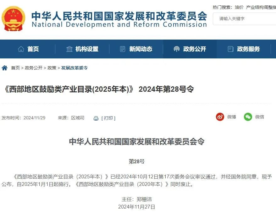 中國粉體網訊 近日,經國務院同意,國家發展改革委修訂出臺《西部地區鼓勵類產業目錄(2025年本)》(以下簡稱《目錄》),自2025年1月1日起施行。