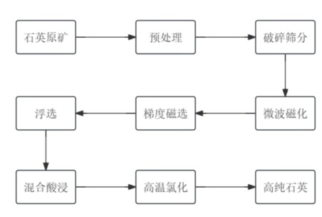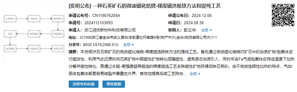 而潤優新材的“一種石英礦石的微波磁化焙燒-梯度磁選除鐵方法和提純工藝”發明提供了一種石英礦石的微波磁化焙燒-梯度磁選除鐵方法和提純工藝,該方法工序簡單且除雜效率極高,可針對性地去除石英砂中的各類弱磁性礦物及氣液包裹體。