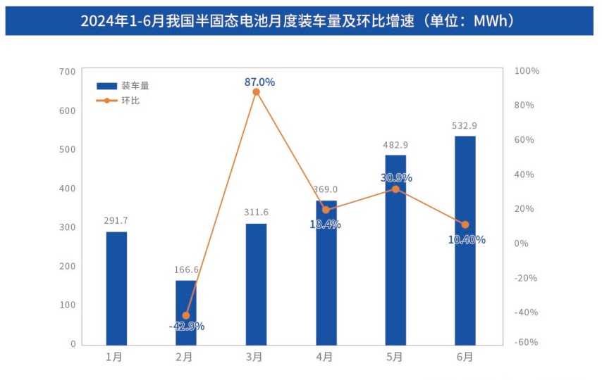 2024年,蜂巢能源、太藍新能源、清陶能源等電池企業紛紛推出半固態電池產品,推動固態電池產業發展。2024年也被視為半固態電池裝車元年,目前來看,蔚來、上汽、廣汽等車企均已發布半固態電池方案并部分實現裝車。通過中國汽車動力電池產業創新聯盟統計的數據發現,2024年上半年,我國半固態電池累計裝車量達2154.7 MWh。