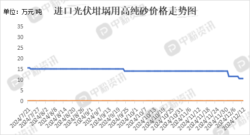 據中粉資訊,截至12月5日,進口光伏坩堝用高純石英砂市場主流價格呈平穩,近期有下降趨勢:進口的光伏坩堝內層用高純石英砂的均價由14萬元/噸下調為11.5萬元/噸,環比上周下調17.86%。截至12月12日,進口的光伏坩堝內層用高純石英砂的均價下調為10.5萬元/噸,環比上周下調25.00%。