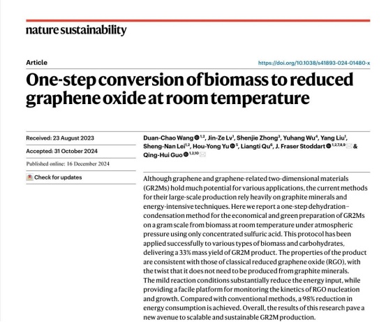 近日,浙江大學杭州國際科創中心未來科學研究院王端超研究員聯合清華大學郭慶輝研究員,諾獎得主、美國西北大學J. Fraser Stoddart教授研發了一種一步脫水縮合法,該方法僅使用濃硫酸,即可在室溫下從生物質纖維素廢物中以克為單位經濟且綠色地制備石墨烯相關二維材料(GR2M),這種溫和而有效的方法為可持續廢物管理鋪平了道路,也為循環經濟做出了貢獻。