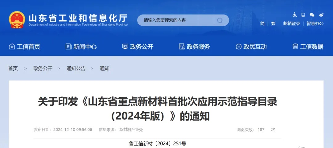 中國粉體網訊 12月10日,山東省工業和信息化廳印發《山東省重點新材料首批次應用示范指導目錄(2024年版)》。