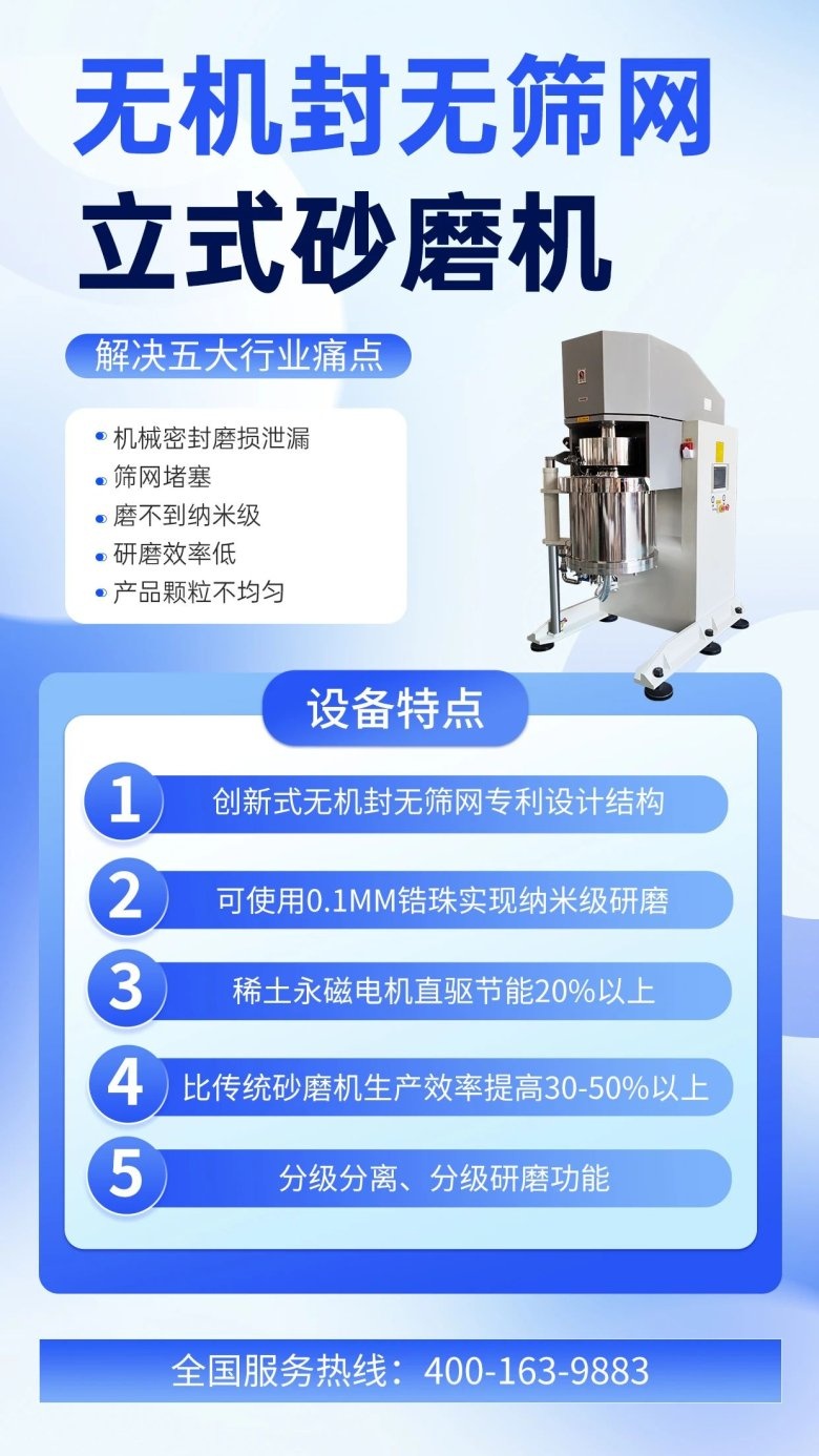 SP系列立式砂磨機具備無機封、無篩網的特點,同時兼具分級分離的功能。這一創新設計不僅避免了傳統砂磨機常見的篩網易堵塞、機械密封維修成本高等問題,還實現了真正的納米級研磨,大大提高了研磨效率和物料質量。產品廣泛應用于陶瓷材料、碳材料、能源材料、隔膜材料、硅碳負極、固態電解質、數碼噴墨、礦物材料、納米涂料、油墨、顏料、色漿、農藥、醫藥、化妝品、納米新材料等領域。