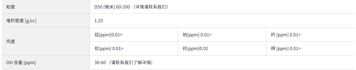 目前,市場上僅有日本三菱一家生產的合成非晶體石英砂產品,三菱化學合成石英砂是采用醇硅法制成的超純合成二氧化硅粉末,其產品純度達到7N級別,是經過30多年制造技術改進的產品。它是高性能石英玻璃產品的原材料,可以將各種金屬元素抑制到極低的水平。它的金屬雜質總量小于1ppm,是半導體制造中不可或缺的材料,正變得越來越高度集成,并用作制造高純度石英零件和硅晶片的石英坩堝的原材料。此外,對于各種光學應用,可以制造從紫外線到紅外范圍具有出色透射率的玻璃。